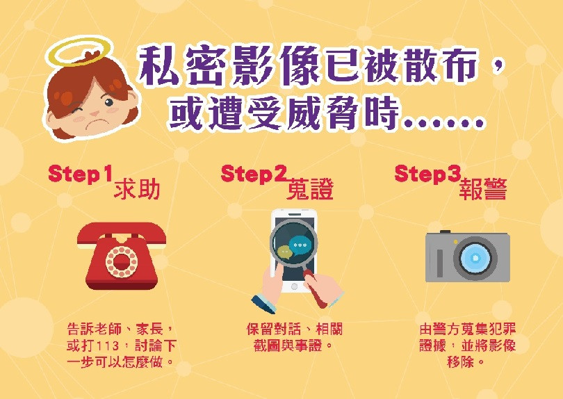 家長應留意孩子上網與交友狀況。在使用社群平台或群組時,不只學習如何進入,孩子也要學習如何設定隱私、封鎖、檢舉、關閉攝影機、退出等功能,在情況不對勁時,要知道怎麼保護自己。若接獲不雅影像或暴力犯罪內容,也可以至iWIN檢舉,避免孩子身心受到不良影響。若不幸遭受私密影像外流,記得先不要刪除任何資訊,保存證據,並向信任的親朋好友、警方、社政單位(113 專線、社會安全網-關懷e起來 )或撥打02-6605-7373 私ME諮詢專線求助,或至私ME申訴服務網線上申訴協助移除影像。保存證據時,要儲存外流網址、頁面截圖、關鍵對話,盡量保存到完整的發布者帳號及ID、發布時間及日期,資訊保存越完整,才能讓後續協助更為順利。為避免後續受到加害者及莫名網友騷擾、威脅,請記得同步調高社群或通訊軟體帳號的隱私設定,確保自身隱私與資訊安全。