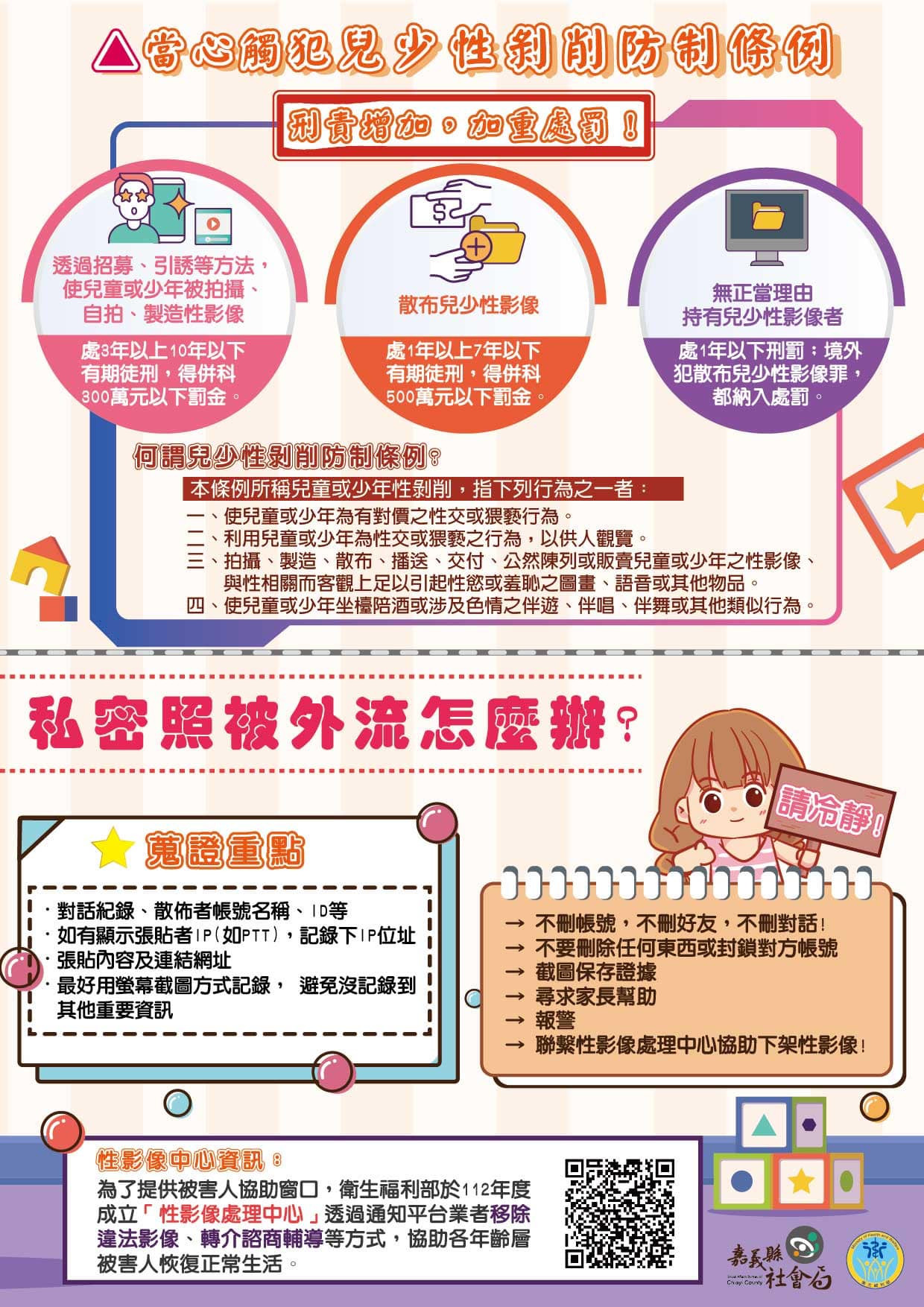 影像一經散播,將無法掌控會被哪些人觀看,甚至會被他人輕易複製、下載、散播、變造。影像中透露的人物特徵、拍攝地點、學校資訊等資料,都有可能被辨識出真實身分,導致影像中人可能被肉搜、跟蹤或騷擾。若被有心人利用,困擾與風險相當可觀。根據衛福部統計,每年有超過800件兒少性剝削案件與未成年人的私密影像相關。近七成的兒少是在被誘騙、要脅的狀況下自拍照片後傳給加害人;而散播影像者有七成為被害者熟識的人,分別是同學、網友、男友或前男友。